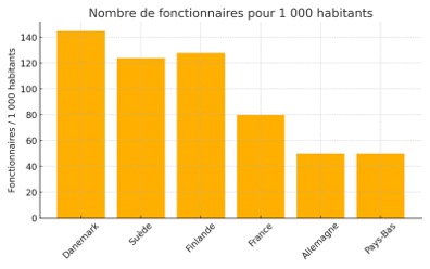 La France compte environ 80 fonctionnaires pour 1 000 habitants, soit moins que de nombreux pays européens à la dette pourtant bien plus faible. Les pays nordiques – Danemark, Suède, Finlande – ont entre 120 et 145 fonctionnaires pour 1 000 habitants, tout en maintenant des finances publiques plus solides.
