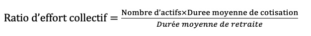 Le ratio d’effort collectif est un indicateur qui mesure combien d’années de cotisation sont disponibles, en moyenne, pour financer une année de retraite. Il combine trois éléments :