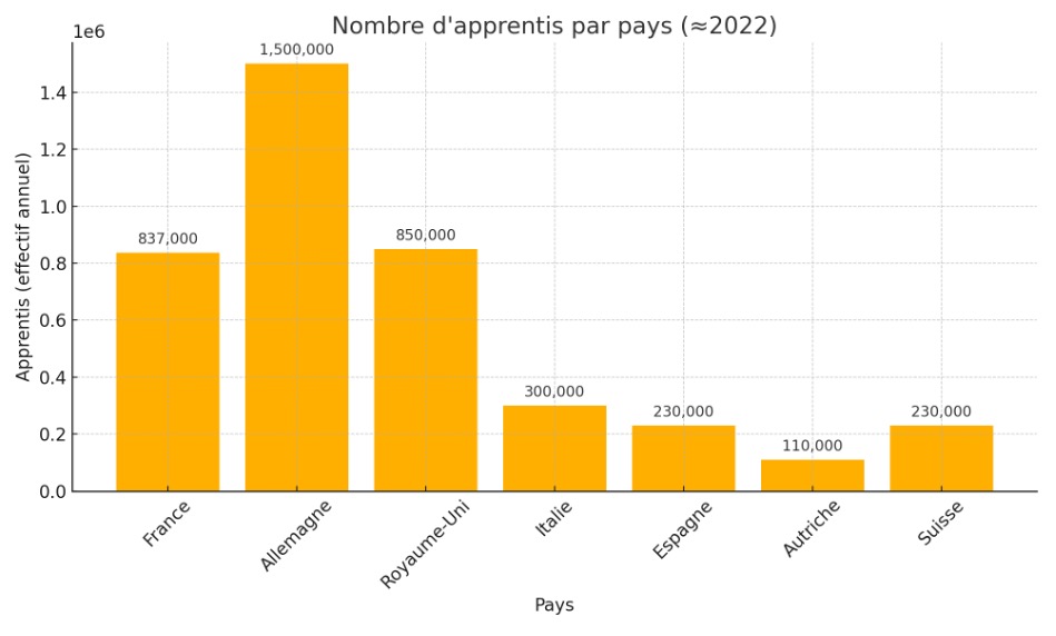 Le tableau ci-dessous montre que la France a rattrapé une partie de son retard en volume, mais reste derrière l’Allemagne en proportion d’apprentis dans la population active. Elle dépasse désormais l’Italie, l’Espagne et rivalise avec le Royaume-Uni en termes absolus.