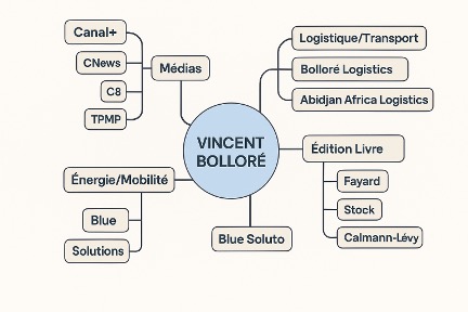 Le cœur du groupe Bolloré repose sur Bolloré SE, société familiale contrôlée via une structure de holdings. À travers sa participation majoritaire dans Vivendi, le groupe contrôle un vaste portefeuille d’actifs dans les médias, l’édition, la logistique et l’énergie/mobilité. La carte mentale suivante résume les principales branches de l’empire Bolloré :