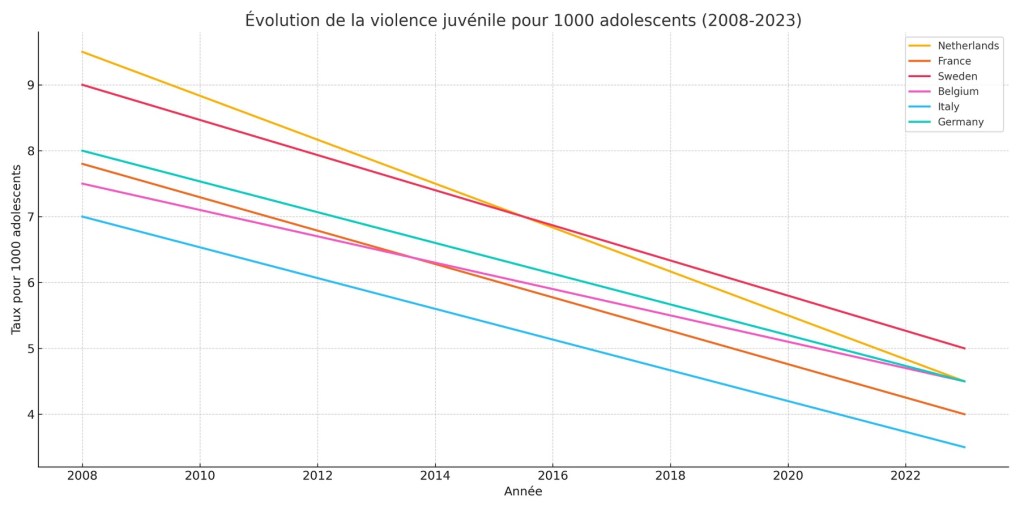 Je n’ai pas voulu me contenter de mon ressenti. Je suis allé chercher les données, les tendances, les comparaisons. J’ai découvert que la violence juvénile, en France comme en Europe, est en baisse depuis plus de quinze ans. J’ai constaté que les hausses apparentes sont le plus souvent des effets d’enregistrement, de redéfinition juridique, ou de sensibilisation sociale.