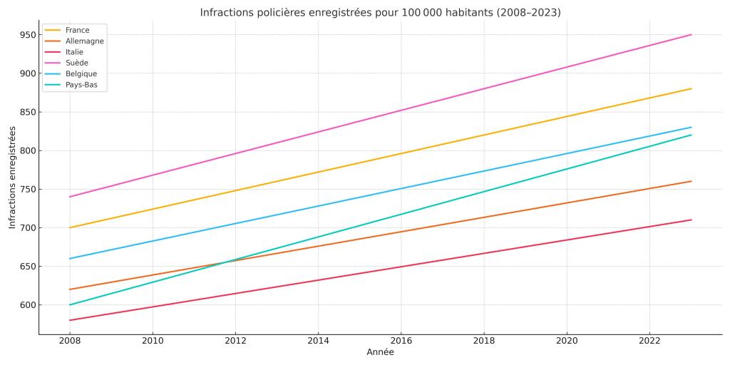 Le graphique comparatif illustre l’évolution du nombre d’infractions policières enregistrées par 100 000 habitants entre 2008 et 2023 dans six pays européens : France, Allemagne, Italie, Suède, Belgique et Pays-Bas. Il s’agit d’une mesure standardisée issue des bases Eurostat, qui permet de suivre les tendances de signalement des faits violents ou délictueux.